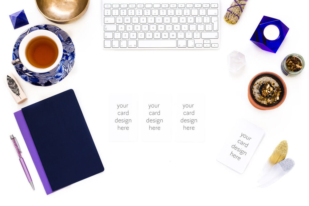 I wanted these images to be both visually appealing and versatile, so you can use them for everything you need. They include white cards where you can overlay your deck designs, electronics where you can overlay photos of lead magnets, e-books, and any page of your website, and meditations, and card combinations to show free readings you may do to promote your work. You can also add text and color overlays (blocks of color) and crop them by zooming into small details, to maximize their usage.