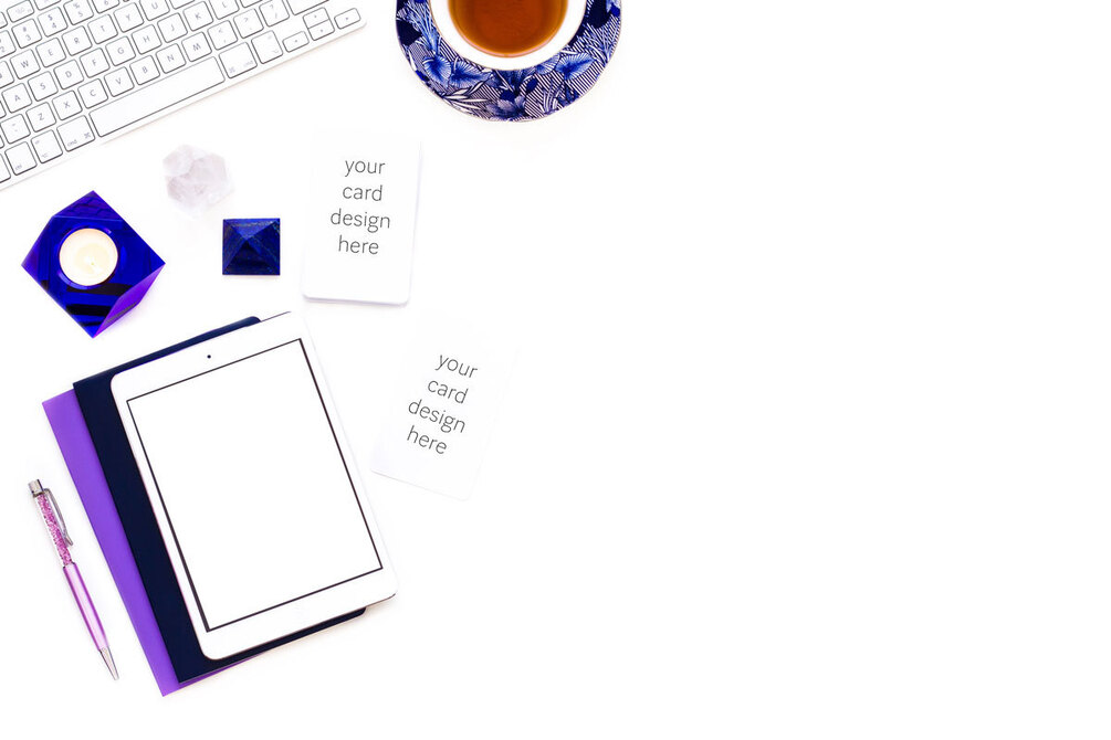 I wanted these images to be both visually appealing and versatile, so you can use them for everything you need. They include white cards where you can overlay your deck designs, electronics where you can overlay photos of lead magnets, e-books, and any page of your website, and meditations, and card combinations to show free readings you may do to promote your work. You can also add text and color overlays (blocks of color) and crop them by zooming into small details, to maximize their usage.